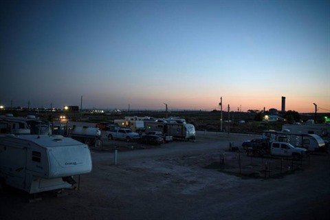 | Des camping-cars de travailleurs du pétrole sur une aire d'accueil, le 6 mai à Carlsbad, au Nouveau-Mexique. |