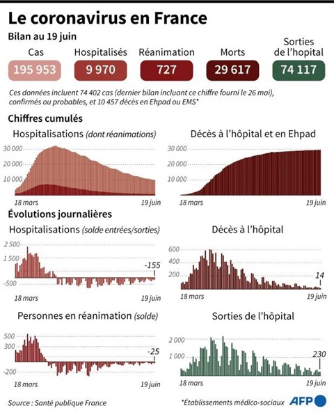Le nombre total des personnes hospitalisées est passé sous la barre des 10.000, avec 9.970 personnes. Mais "Le virus est toujours présent sur l’ensemble du territoire national et la prudence doit rester de mise", a mis en garde vendredi 19 juin la DGS.