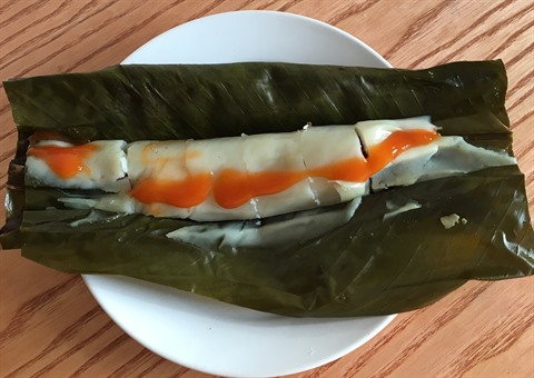 Le gâteau est fabriqué à partir de farine de riz, enveloppé dans des feuilles de dong et de bananier en une forme cylindrique longue et mince, puis cuit à la vapeur.