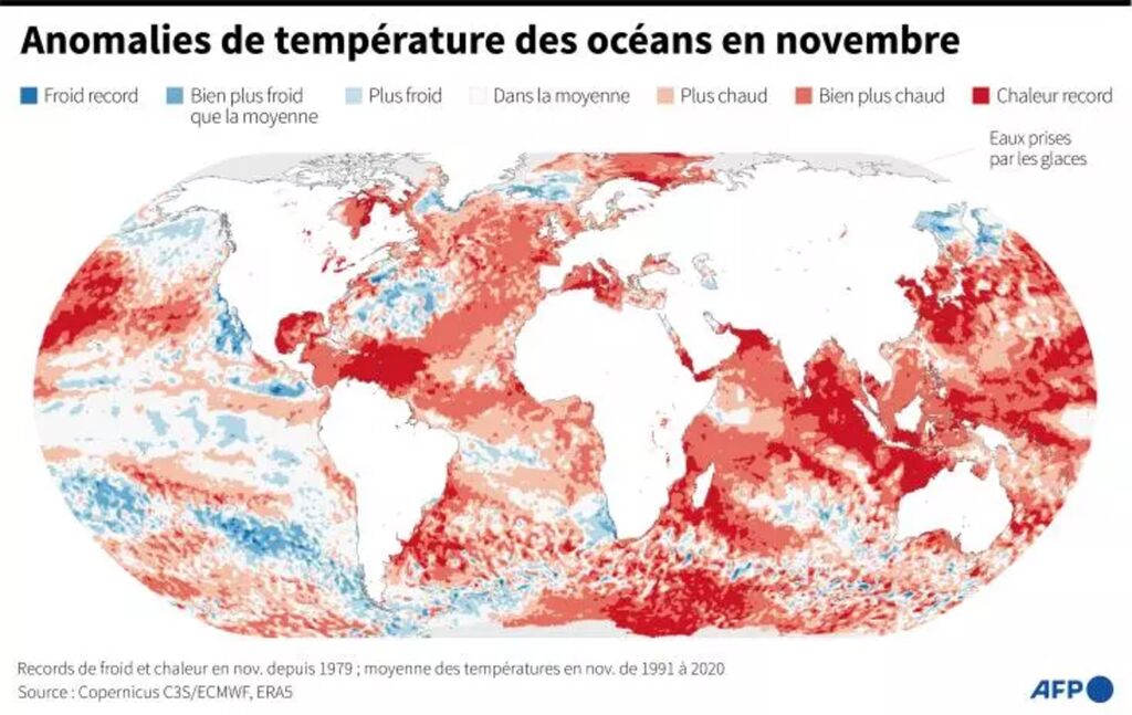 | Carte du monde montrant les anomalies de température à la surface des océans en novembre, selon les données Copernicus C3S/ECMWF. |