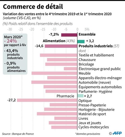 | Variation des ventes du commerce de détail par secteurs entre le 4e trimestre 2019 et le T1 2020, en volume CVS-CJO en % selon la Banque de France. |