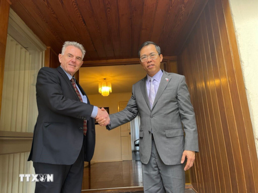 | Le président de l’Association d’amitié Australie - Vietnam, Kim Sampson (à gauche), a adressé ses plus chaleureuses félicitations au XIVe Congrès national du PCV. |