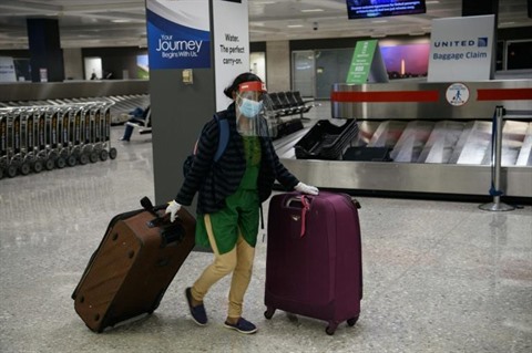 | Une femme tire ses bagages à l'aéroport international de Washington-Dulles, aux États-Unis, en novembre 2020 |