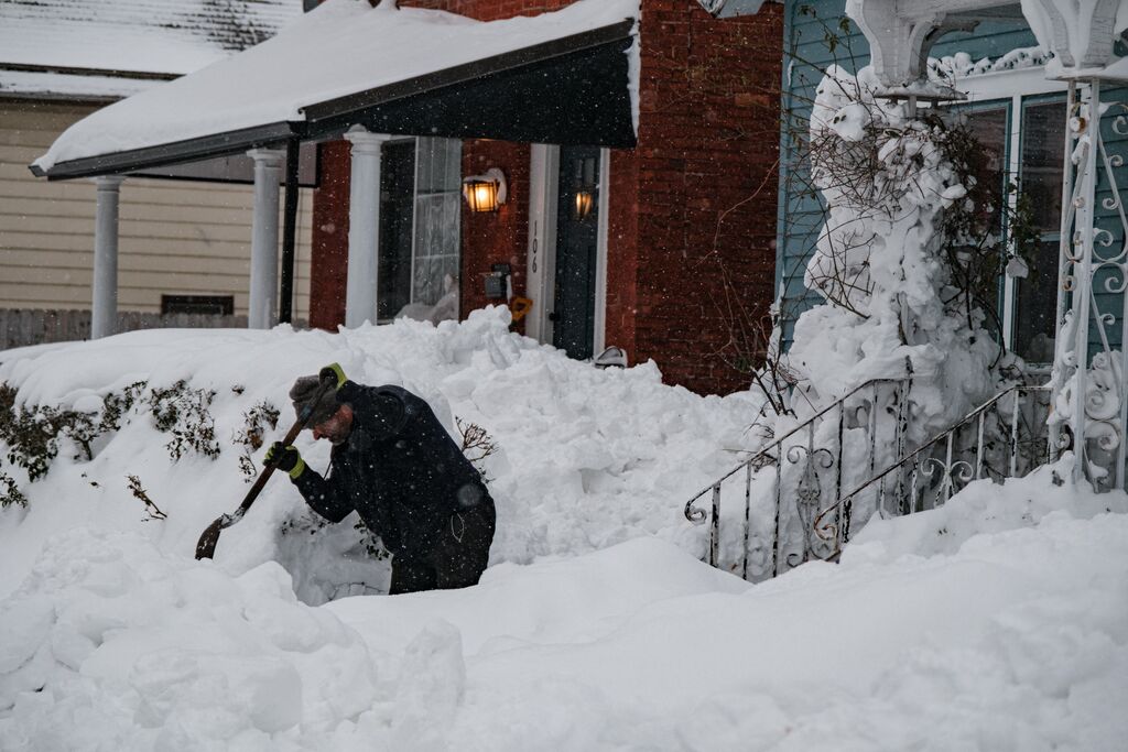 | Un habitant déneige sa maison suite au passage d'un blizzard aux États-Unis. |