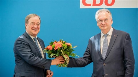 Reiner Haseloff (gauche), chef du gouvernement du Land allemand de Saxe-Anhalt lors d'une conférence de presse avec le chef de la CDU Armin Laschet, le 7 juin. Photo : AFP/VNA/CVN |