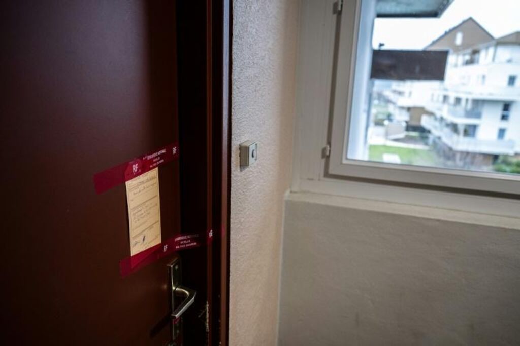 | Des scellés sont apposés le 6 janvier 2023 sur la porte d'un appartrement à Rumilly, en Haute-Savoie, où ont été retrouvés les corps de deux bébés. |