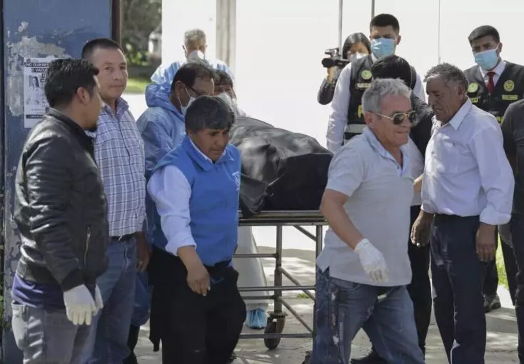 | Le corps d'une victime d'un incendie dans une mine d'or du Sud du Pérou à la morgue d'Arequipa, le 8 mai. |