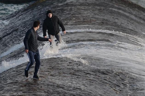 | Des personnes montées sur la digue des Sables-d'Olonne pour regarder les vagues, lors de la "marée du siècle", le 21 mars. |