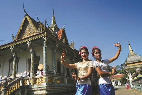| Jeunes filles khmères exécutant une danse traditionnelle dans la pagode Kh’Leng, l’une des plus anciennes de la province de Soc Trang. |