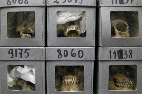 | Des crânes entreposés au sous-sol du Musée de l'homme au Palais de Chaillot à Paris. |