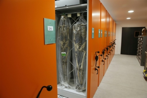 Au fil des réserves rénovées, on découvre des rangées de crânes dans des boîtes toutes neuves, des files de squelettes montés et enveloppés dans du plastique. "Pour éviter que si un os tombe, on ne sache plus à qui il appartient", souligne Mme Huet.