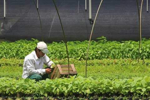 | Des touristes visitent une exploitation agricole dont les plantations compensent l'empreinte carbone de ses visiteurs, à Heredia (Costa Rica) le 28 octobre 2020. |