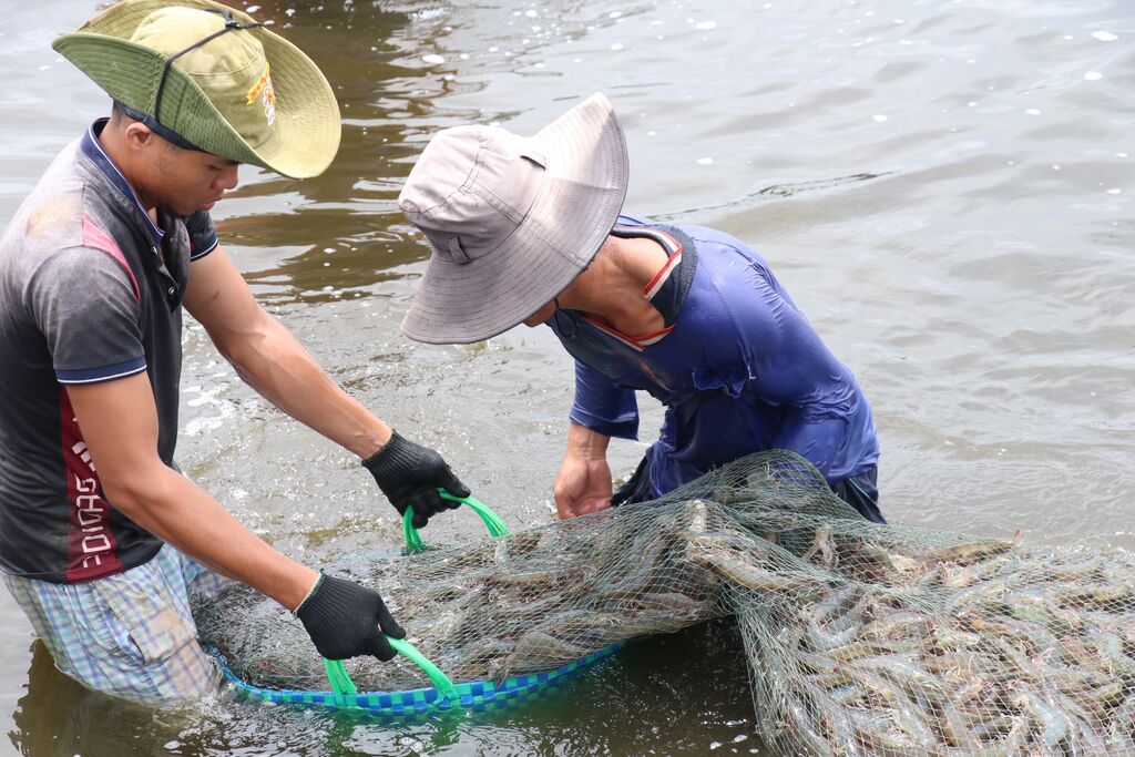 | Récolte de crevettes à pattes blanches à Bên Tre (Sud). |