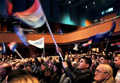 | Des partisans de la candidate croate à la présidentielle, Kolinda Grabar-Kitarovic, lors d'un meeting électoral à Mostar, le 15 décembre. |