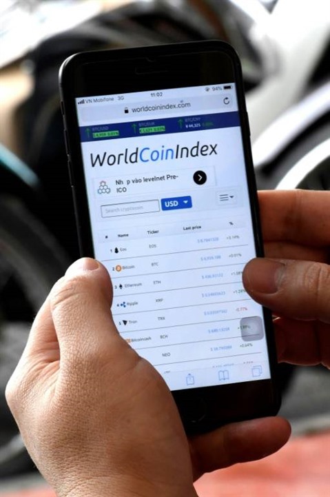| Photo d'un investisseur vietnamien dans les cryptomonnaies qui surveille l'indice "world coin index" sur son smartphone à Hanoï le 12 avril. |