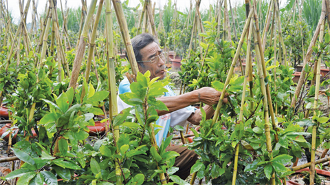 | Pham Tân Loi est très occupé de donner de l’allure à ses abricotiers à l’approche du Têt. |