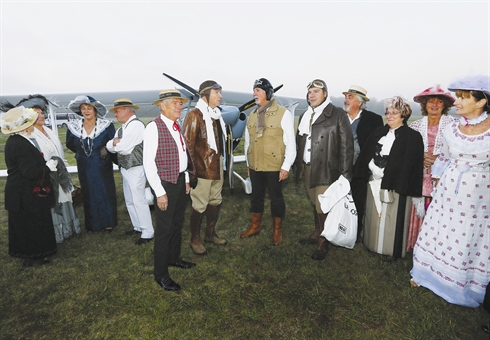| Des habitants en costumes d’époque et les maires de Pauillac et de Villacoublay devant l’ULM FK12 au club d’aviation de Pauillac. |