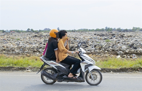 | Des jeunes thaïlandais passent à côté d’une décharge à ciel ouvert dans la banlieue de Bangkok. |