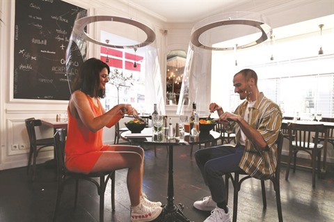 | Un restaurant à Paris équipé d’écrans de protection en plastique pour restreindre les contacts entre les clients. |