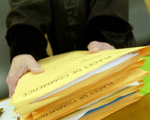 | Un juge de tribunal de commerce manipule des dossiers, le 2 avril 2001 à Caen, avant une audience. |