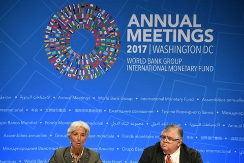 | La directrice générale du FMI, Christine Lagarde, au côté du gouverneur de la Banque centrale du Mexique, Agustin Carstens, le 14 octobre à Washington. |