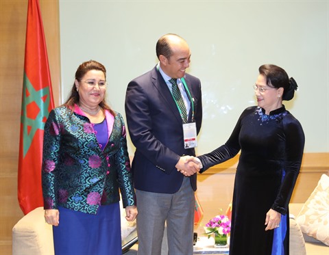 | Mohammed Ouzzine et Mme Hayat Bouffarrachen lors de leur rencontre avec Nguyên Thi Kim Ngân (droite), en marge de l'APPF-26 à Hanoï. |