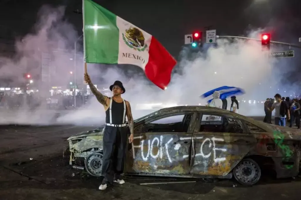 | Un manifestant tient un drapeau mexicain devant l'épave d'une voiture incendiée lors de heurts avec les forces de l'ordre contre l'expulsion d'immigrés, à Los Angeles, le 7 juin en Californie. |