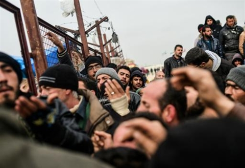 | Des réfugiés syriens ayant fui les combats à Alep attendent à proximité de la ville d'Azaz, près de la frontière turque, le 6 février. |