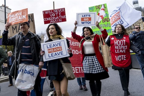 | Des manifestants pro-Brexit près du Parlement à Londres, le 13 mars. |