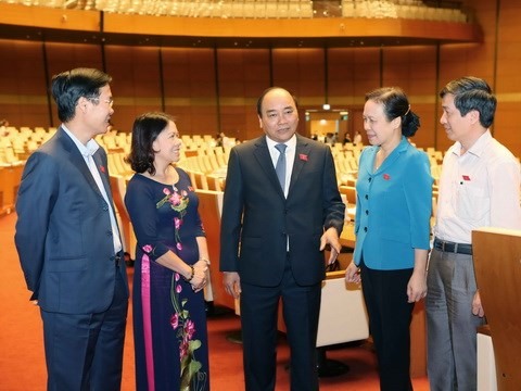 | Le Premier ministre Nguyên Xuân Phuc (centre) avec des députés de la ville de Hai Phong, en marge de la session de l'Assemblée nationale. |
