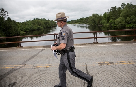 | Un policier de l'État de New York participe à la chasse à l'homme pour retrouver les deux meurtriers évadés, le 15 juin 2015. |