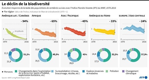 Entre 1970 et 2016, 68% de cette faune sauvage a disparu, selon l'Indice planète vivante, outil de référence publié tous les deux ans par le WWF. La cause principale est la destruction d'habitats naturels, notamment pour l'agriculture, une tendance qui risque de favoriser de nouvelles pandémies du type COVID-19 en mettant au contact humain et animal, ce qui favorise la transmission de virus d'espèce à espèce.