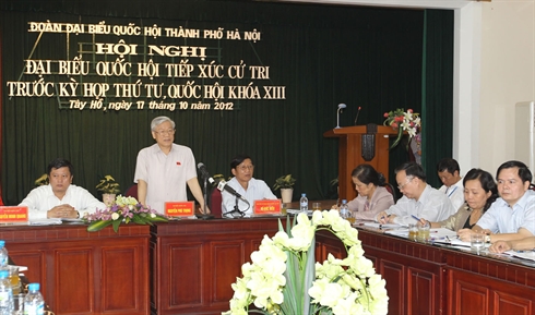 | Le secrétaire général du PCV, Nguyên Phu Trong (debout), lors de la rencontre avec des électeurs de l'arrondissement de Tây Hô, le 17 octobre à Hanoi. |