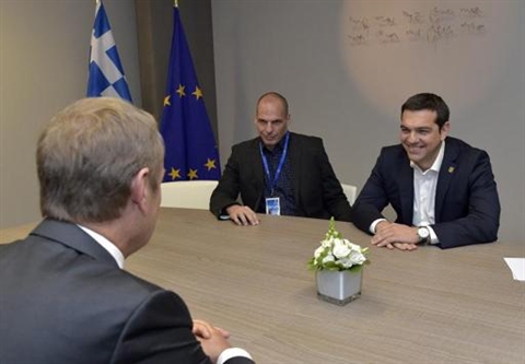 | Le Premier ministre grec Alexis Tsipras (droite) et son ministre des Finances, Yanis Varoufakis (centre), accueillis par le président du Conseil européen, Donald Dusk, le 22 juin à Bruxelles. |
