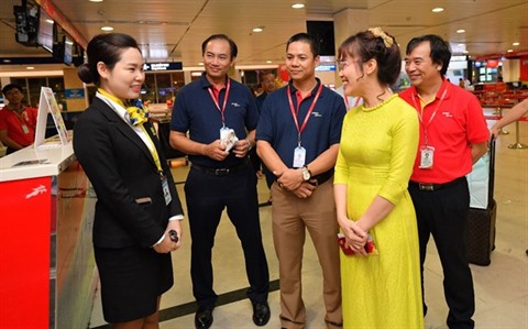 | Les dirigeants de Vietjet rencontrent leurs employés travaillant dans la zone d’enregistrement. |