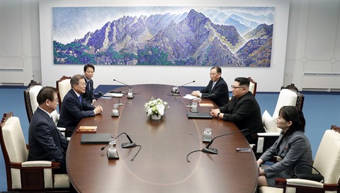 Après avoir participé à une cérémonie de bienvenue officielle comprenant l'inspection d'une garde d'honneur sud-coréenne, les deux dirigeants ont commencé leurs discussions sur la paix et la prospérité de la péninsule coréenne dans une salle de conférence du premier étage de la Maison de la Paix, un bâtiment sud-coréen situé à Panmunjeom, village partagé entre les deux pays. M. Kim est entré dans l'histoire en devenant le premier dirigeant de la RPDC à fouler le sol sud-coréen depuis la fin de la guerre de Corée (1950-1953).