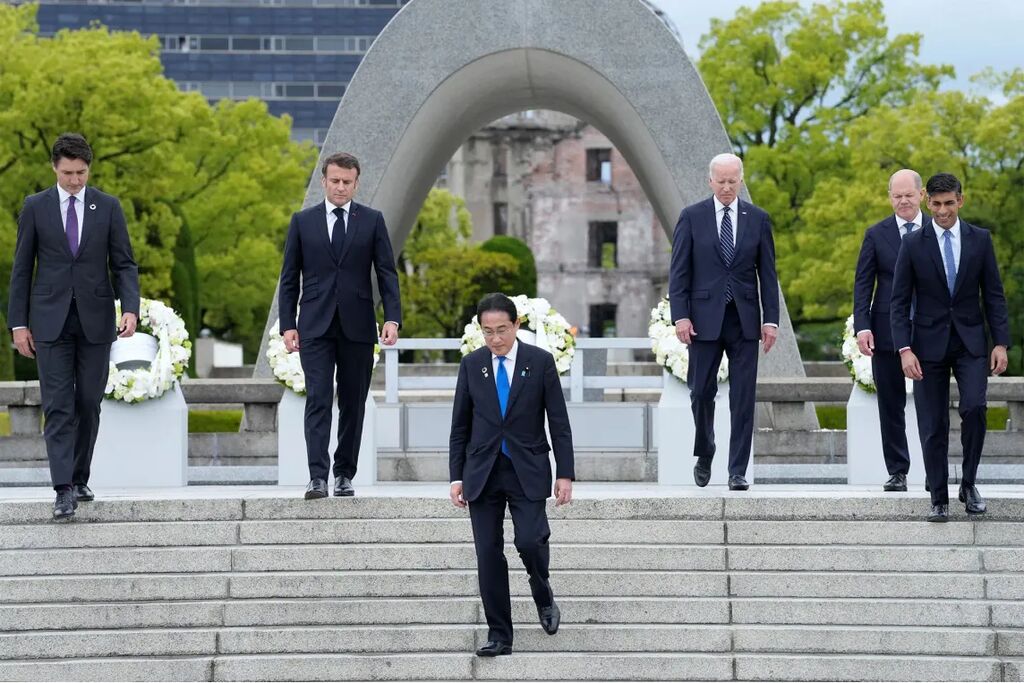 Sous une pluie battante, les chefs d'État et de gouvernement des sept plus grandes démocraties industrialisées, dont plusieurs puissances nucléaires, ont été accueillis un par un au Parc du mémorial de la paix de Hiroshima par le Premier ministre japonais Fumio Kishida.