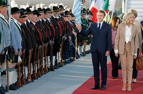 | Le président français Emmanuel Macron et son épouse à leur arrivée à Munich (Allemagne), le 25 juin. |