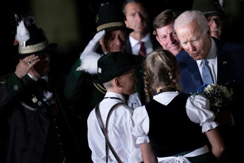 | Le président américain Joe Biden, accueilli à son arrivée à Munich (Allemagne), par des enfants en costumes traditionnels bavarois, le 25 juin, à la veille du sommet du G7. |