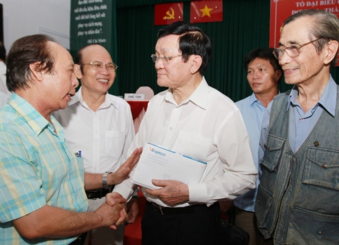 | Le président de la République, Truong Tân Sang (centre) avec les électeurs du 1er arrondissement de Hô Chi Minh-Ville, le 26 juin. |
