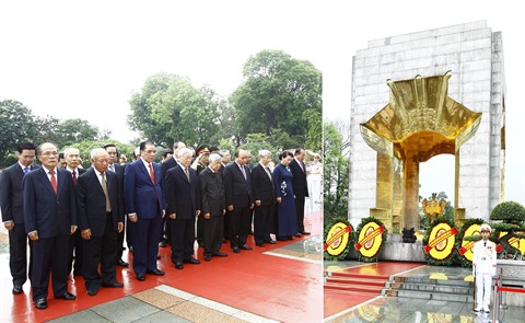 | Des dirigeants du Parti et de l’État rendent hommage au Président Hô Chi Minh, le 18 mai à Hanoï. |