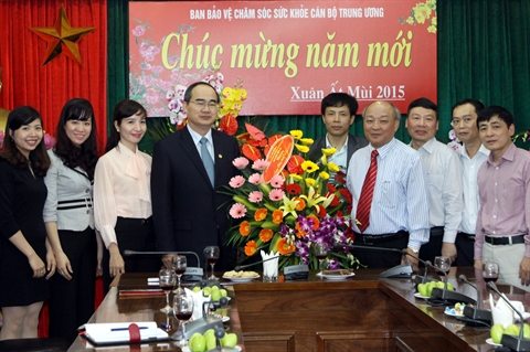 | Le président du Front de la Patrie du Vietnam, Nguyên Thiên Nhân (4e à gauche), félicite les médecins du Comité de protection et de soins de la santé des hauts fonctionnaires de l'État. |