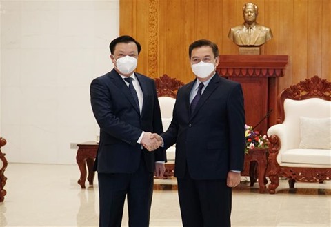 | Le Premier ministre laotien Phankham Viphavan (droite) et Dinh Tiên Dung, membre du Bureau politique, secrétaire du Comité municipal du Parti de Hanoï, le 4 avril. |