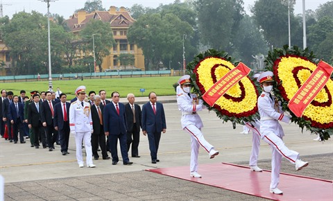 | La délégation des dirigeants du Parti et de l’État du Vietnam rend hommage au Président Hô Chi Minh, le 30 avril. |