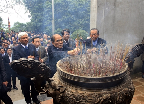 | Le président de l’Assemblée nationale, Nguyên Sinh Hùng, offre de l'encens aux rois Hùng. |