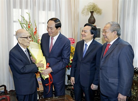 | Le président de la République, Trân Dai Quang (2e à gauche), offre un bouquet de fleurs au professeur Vu Khiêu. |