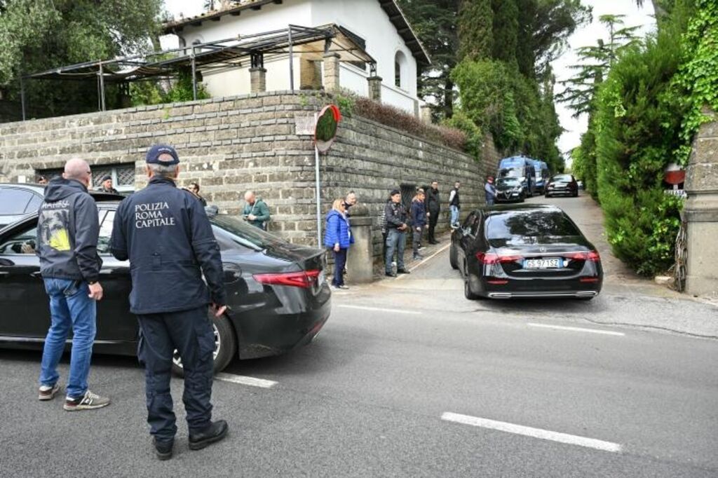| Des véhicules de la délégation iranienne escortés par la police italienne arrivent à la résidence de l'ambassadeur d'Oman à Rome, le 19 avril. |