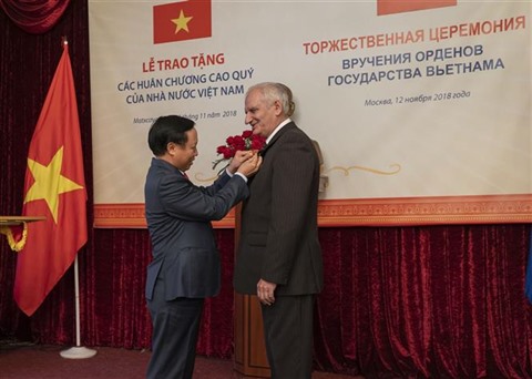 | L'ambassadeur du Vietnam en Russie Ngô Duc Manh (gauche) remet la distinction honorifique du Vietnam à un cadre du FSO, le 13 novembre. |