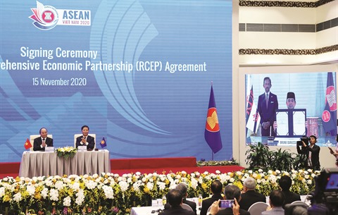 Après huit ans de négociations, le 15 octobre, les dix pays membres de l’Association des nations de l’Asie du Sud-Est (ASEAN) et ses cinq partenaires (Australie, Chine, République de Corée, Japon, et Nouvelle-Zélande) ont signé le Partenariat régional économique global (RCEP - Regional Comprehensive Economic Partnership). Cet accord a créé le marché de libre-échange le plus grand du monde, avec 2,2 milliards de consommateurs, représentant plus de 30% de la population mondiale et un PIB d’environ 27.000 milliards d’USD, soit 30% du PIB mondial. Il constitue un accord intégral et ouvre de nouvelles opportunités de coopération commerciale multilatérale en Asie-Pacifique, créant une force motrice pour la croissance et la reprise de l’économie mondiale affectée fortement par la pandémie de COVID-19.