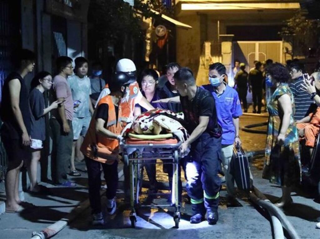 | Évacuer les victimes de l'incendie d'un mini-immeuble dans la rue Khuong Ha, quartier de Khuong Dinh, arrondissement de Thanh Xuân, à Hanoï. |